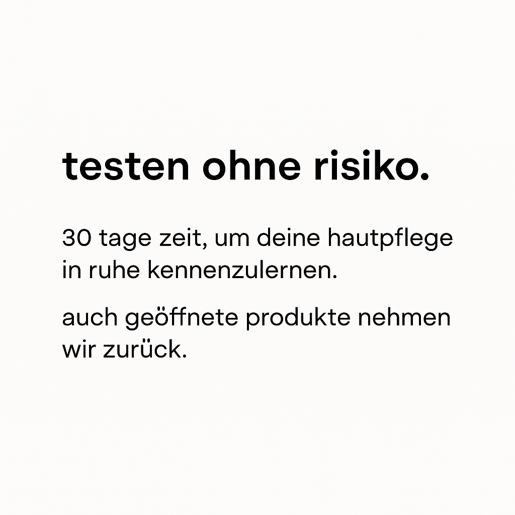 Wir wissen, dass viele Menschen mit Hautproblemen wie Neurodermitis oder Schuppenflechte schon viel Geld für Produkte ausgegeben haben – oft ohne spürbare Wirkung. Deshalb bieten wir eine kompromisslose 30-Tage-Geld-zurück-Garantie. Diese gilt selbstverständlich auch für bereits angebrochene Produkte. Du gehst kein Risiko ein – aber wir sind überzeugt: Unsere Produkte machen den Unterschied.