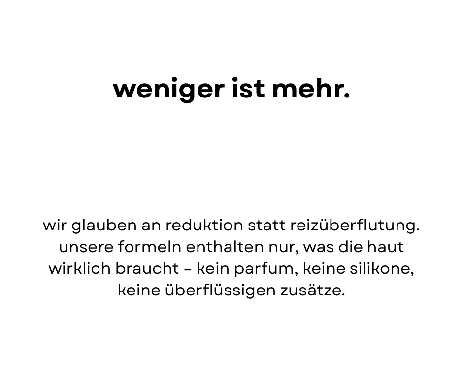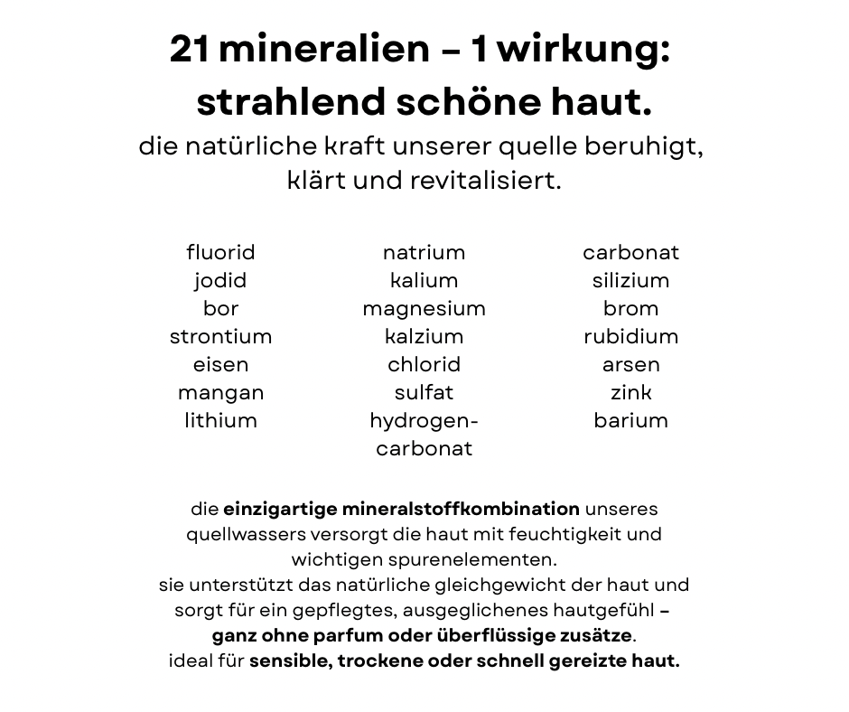 Unsere Pflege basiert auf reinem Quellwasser mit 21 Mineralien – sanft formuliert, vegan und frei von allem Überflüssigen.